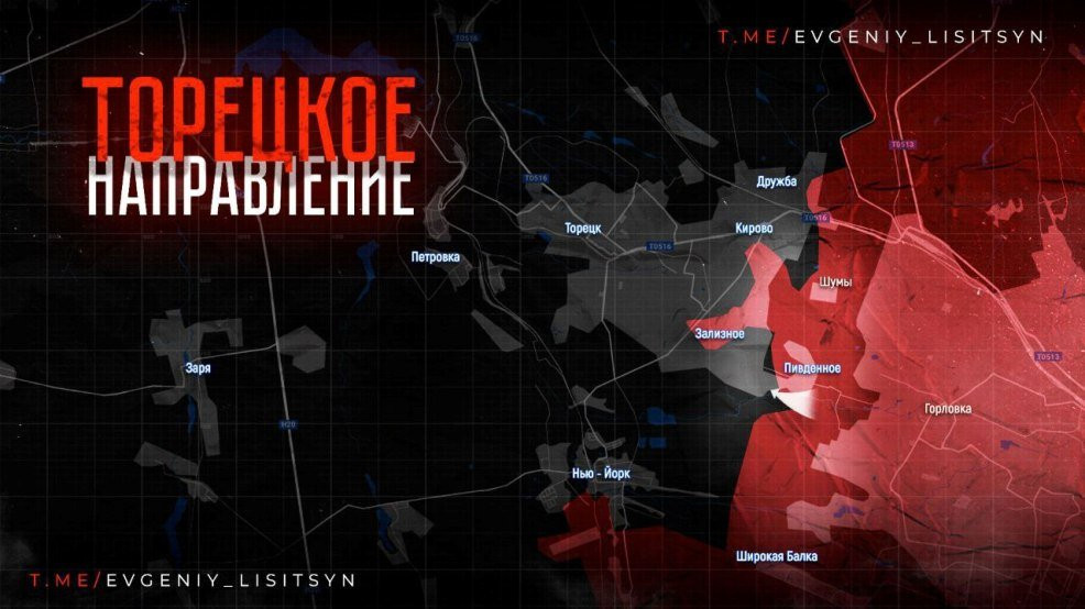На Торецком направлении штурмовые подразделения Армии России продолжают расширять зону контроля в Кирово (Пивничном), Артёмово (Зализном) и Нью-Йорке (Новгородском). Украинские источники утверждают, что уже началась битва за Торецк (Дзержинск), однако кадров объективного контроля это подтверждающих пока что нет.