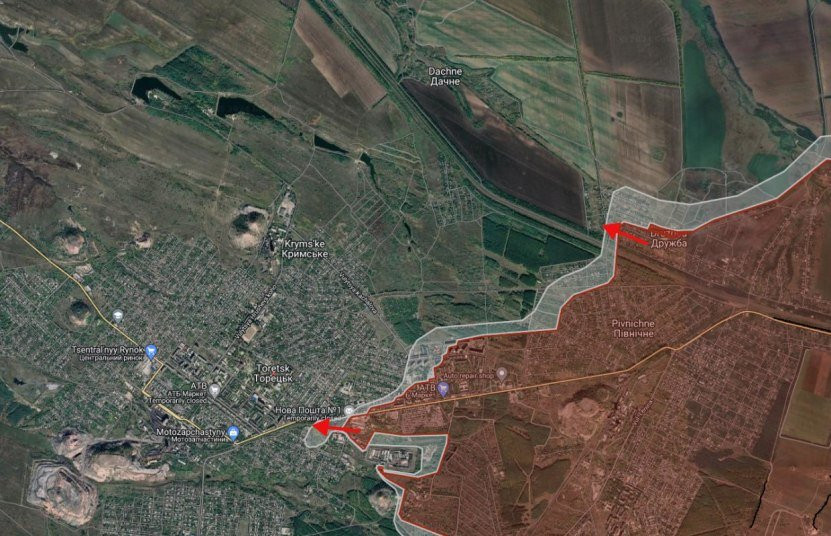На Торецком направлении ВС РФ продвинулись в южной части Торецка, под контроль перешла южная часть мкр «Забалка». В западной части Дружбы российские войска ведут зачистку в районе ул. Дальняя.