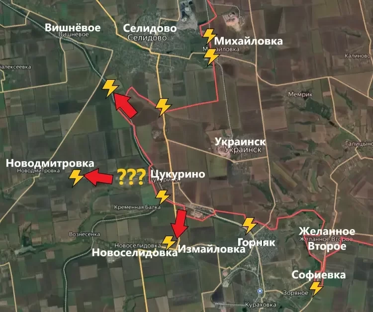 На Селидовском направлении на восточных окраинах Селидово продолжаются бои. Вражеские источники с тревогой сообщают о продвижении ВС РФ в сторону Вишнёвого. Это необходимо для взятия Селидово в мешок.