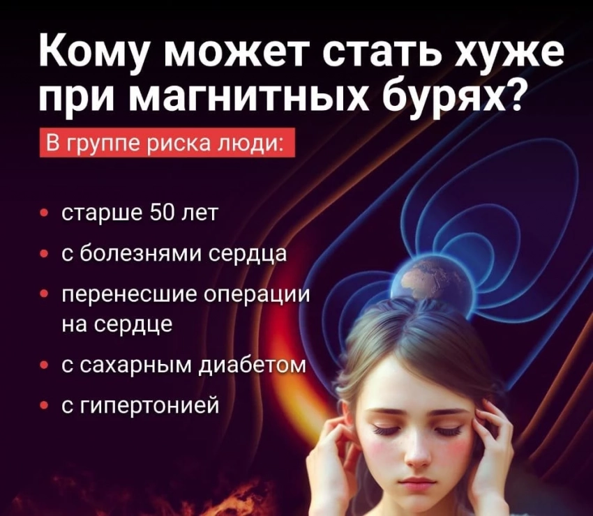 Последствия магнитных бурь чаще всего ощущают люди, страдающие от хронических заболеваний и проблем с сердцем и артериальным давлением. Также на геомагнитную активность часто жалуются люди после 50 лет. Среди главных симптомов: головная боль, повышенная утомляемость и снижение концентрации внимания.