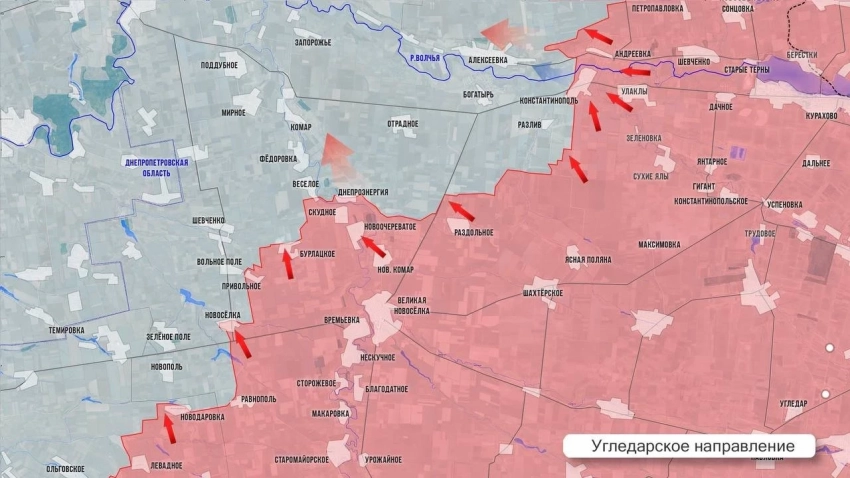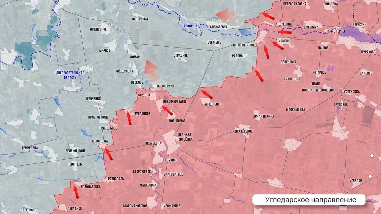 На Угледарском фронте противник контратакует в районе Вольного Поля и Весёлого, сдерживая наши попытки наступления на Комар. Более ожесточённое сражение идет в районе Разлива. Там украинские околовоенные источники признают закрепление российского десанта на южных окраинах села. Упорные бои идут к западу от Константинополя.