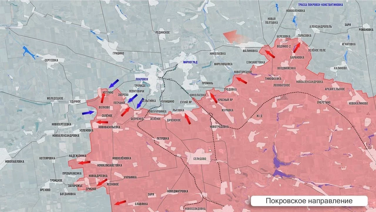 На Покровском фронте тяжёлые бои, мощь которых практически не отражается на изменении линии фронта. Есть тактические успехи в Удачном и Песчаном. В Котлино и Зверево – без изменений. Упорнейшие схватки проходят у северных границ Шевченко, где ВС РФ практически выдавили противника за черту посёлка. Позиции в Успеновке продолжают переходить из рук в руки с переменным успехом. В Лысовке и Сухом Яре армия России перехватывает инициативу и постепенно возвращает оставленные ранее позиции. На восточном фланге продолжается сражение за Тарасовку. ВСУ периодически контратакуют в районе Водяного Второго и Берёзовки.