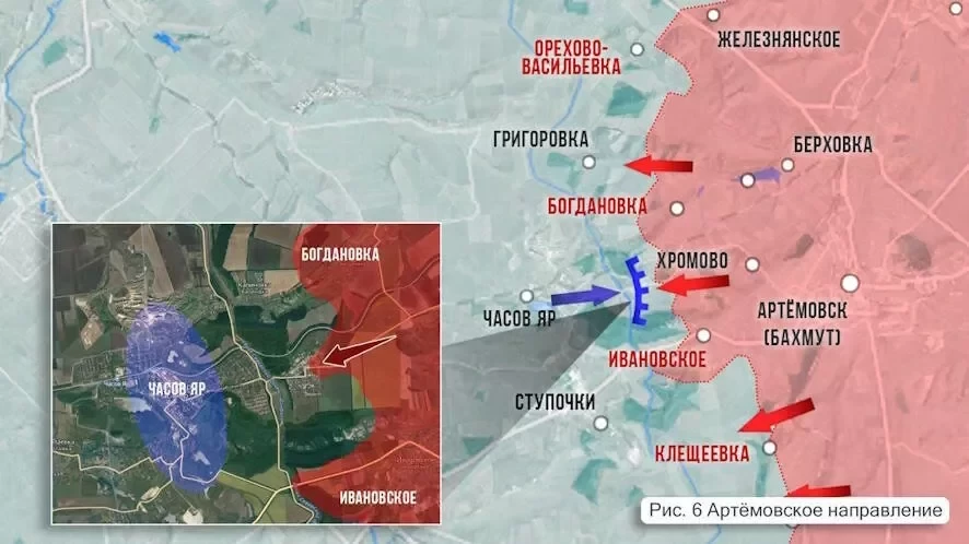На Артемовском фронте ВСУ контратаковали у Богдановки, наши рубежи удержали. Ожесточенные бои идут в районе Клещеевки. Из пригородов наши продолжают охватывать Часов Яр в клещи. В мкр Канал наши тоже продвинулись.