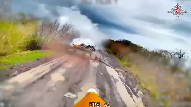 Похоже, танк двигался по тыловой части дороги, однако наехал на противотанковую мину, выходит, установленную украинскими саперами. По обездвиженной бронемашине сразу отработал высокоточный барражирующий боеприпас «Ланцет». Ну и чтобы уж совсем не оставить противнику шансы на эвакуацию и возможное восстановление машины, танк добили наши FPV-дроны.