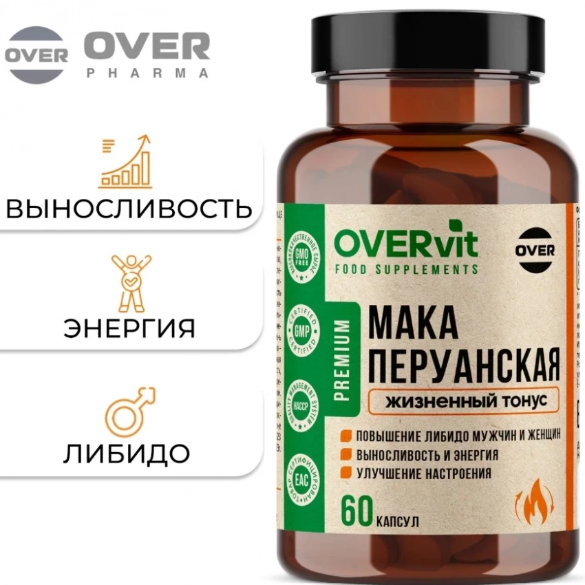 «Мака перуанская» от OVER — эффективная биологически активная добавка, которая заслуженно входит в топ БАДов для потенции мужчин. Продукт усиливает выработку АТФ, повышая энергетический потенциал организма и улучшая выносливость. Благодаря высокому содержанию алкалоидов, мака положительно влияет на уровень половых гормонов, усиливает либидо и способствует нормализации репродуктивной функции. В составе также есть витамины и аминокислоты, что делает препарат полезным не только для сексуального здоровья, но и для общего укрепления организма.