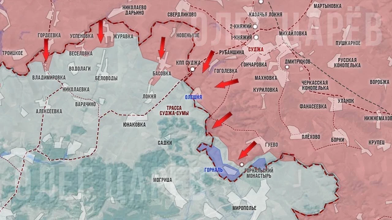 В Курской области Вооружённые силы Российской Федерации (ВС РФ) ведут тяжёлые бои за оставшиеся участки приграничья в районах Олешни и Горнали, здесь Вооружённые силы Украины (ВСУ) отчаянно сопротивляются. Несмотря на тяжёлые бои, Южнее Гуево наши продвинулись по балке Холодный Яр и отвоевали очередные позиции у реки Псёл.
