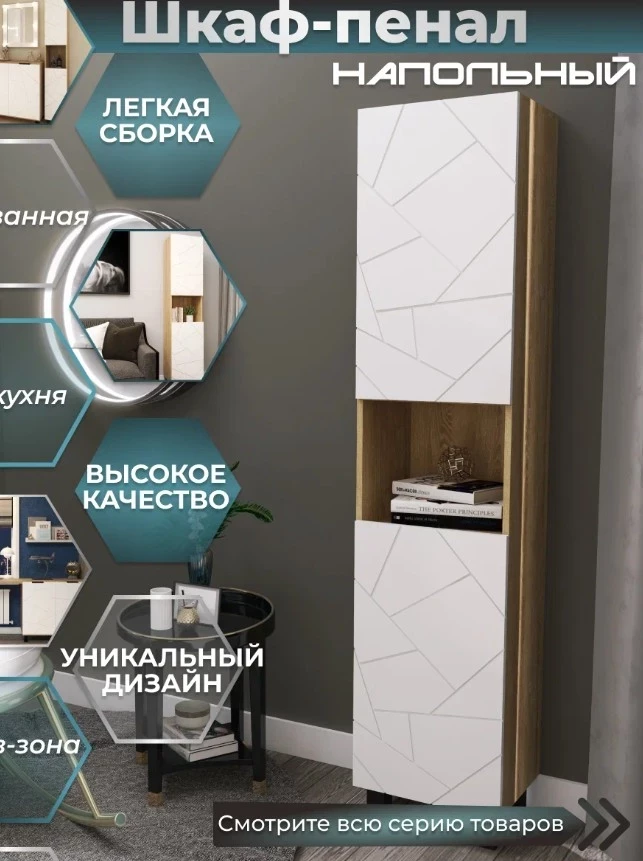 Шкаф-пенал от АКВАМИКС — это удачный пример того, как выбрать качественную мебель для ванной комнаты, не переплачивая за бренд. Модель выполнена из прочного ЛДСП с фасадами из влагостойкого МДФ, покрытыми пленкой Soft-touch, что делает её не только практичной, но и визуально привлекательной. Несмотря на компактные размеры, пенал вмещает пять полок, включая открытую зону для быстрого доступа к нужным вещам. Пластиковые ножки и возможность регулировки высоты придают дополнительное удобство, а отсутствие отверстий под ручки позволяет кастомизировать изделие под любой интерьер.