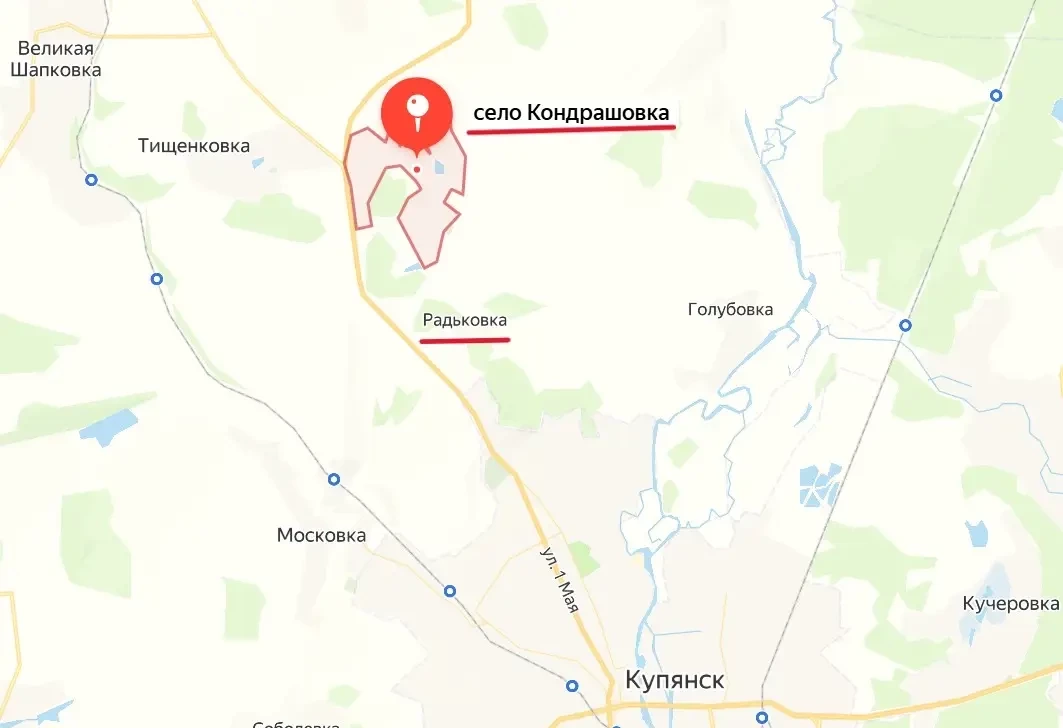 А всего за неделю наши военнослужащие освободили 13 населенных пунктов. Расположенное недалеко от Кондрашовки село Радьковка перешло под контроль российской армии 23 мая. Освобождение этих двух населенных пунктов открывает нашим подразделениям с севера прямую дорогу на Купянск. От Радьковки до окраин города остался примерно один километр.
