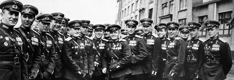 Летчики — Герои Советского Союза — участники Парада Победы. Пятый справа — гвардии капитан Виталий Иванович Попков, комэск 5-го гвардейского истребительного авиаполка, дважды Герой Советского Союза (лично сбил 41 самолет противника). Пока на его груди только одна Золотая Звезда, вторая появится через 3 дня. Факты из его биографии легли в основу фильма «В бой идут одни старики» (прообраз комэска Титаренко («Маэстро») и Кузнечика).