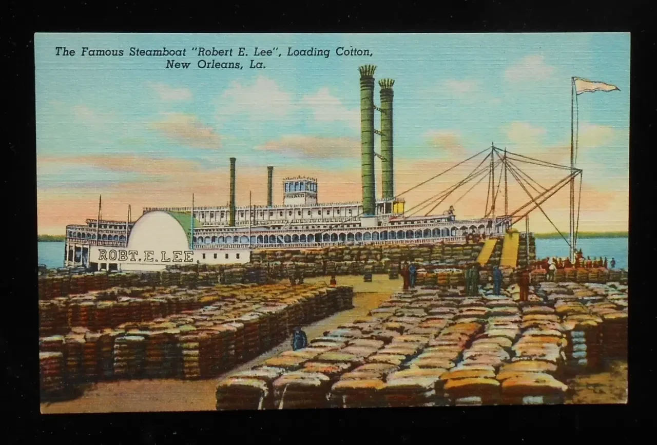 Цветная открытка того времени изображающая пароход «Роберт. Е. Ли» поставленный под погрузку кип хлопка