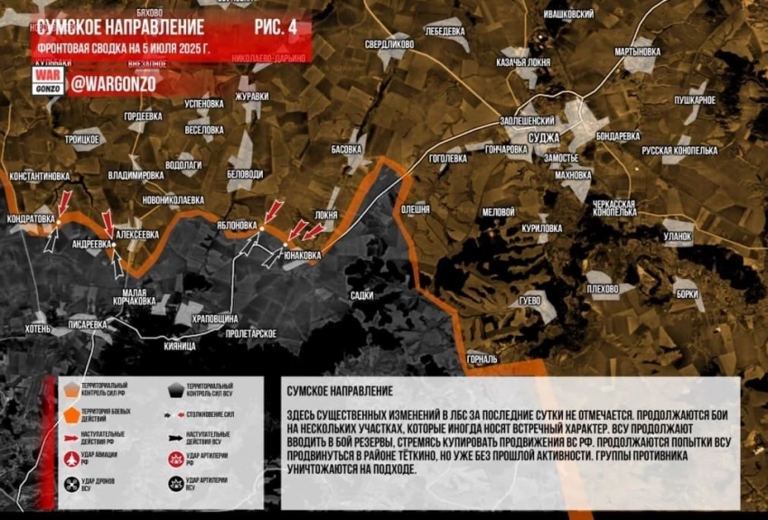 В начале июня украинское командование перебросило на западный фланг Сумского направления резервы, которые задействовали для контратак в районе населенного пункта Андреевка, контроль над которым обеспечит ВС РФ возможность для дальнейшего продвижения на юг. Еще одним направлением контратак противника является рубеж Кондратовка - Константиновка, сейчас на этом участке продолжаются ожесточенные встречные бои. На восточном фланге ВС РФ в ходе серии атак освободили Яблоновку и заняли центр села Юнаковка. В настоящее время противник контролирует меньше половины этого ключевого населенного пункта, отмечает "Военное обозрение".