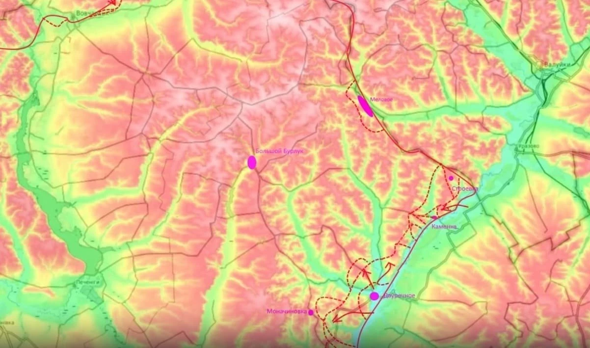 "Здесь мы видим, что группировка противника между Волчанском и Купянском находится в полукольце и, соответственно, сил на самом деле держать весь этот огромный фронт у противника нет. По данным от противника, наши заняли Меловое без серьёзных боёв. Сейчас бойцы ВС РФ начинают двигаться по направлению к Амбарному, Отрадному, где очевидно наше желание выйти на коммуникации противника и пробиться в сторону Большого Бурлука", - пояснил Подоляка.