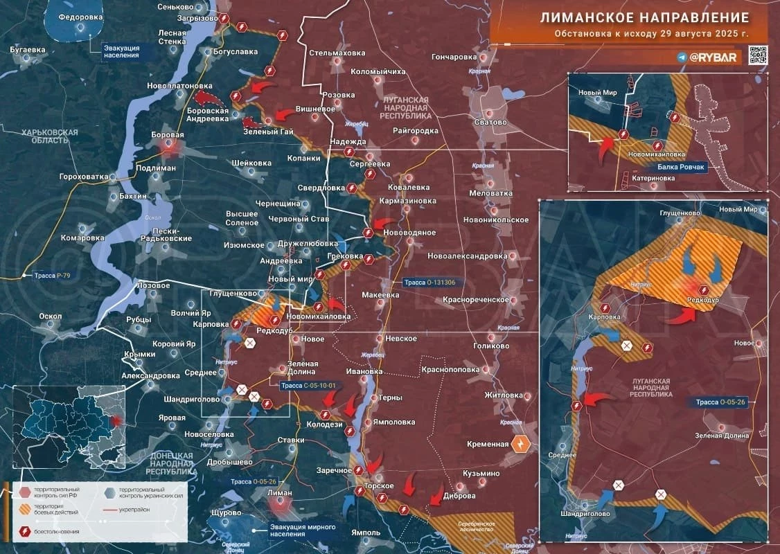 На Краснолиманском участке противник предпринял массированные контратаки в районе Редкодуба и Шандриголова, но понёс потери и отступил. В Новомихайловке противника уже также нет, а ВС РФ практически взяли под контроль Глущенково. В Заречном наши контролируют до половины территории, сообщает в Telegram-канале Олег Царёв.