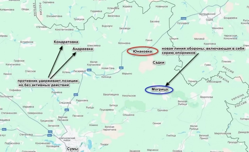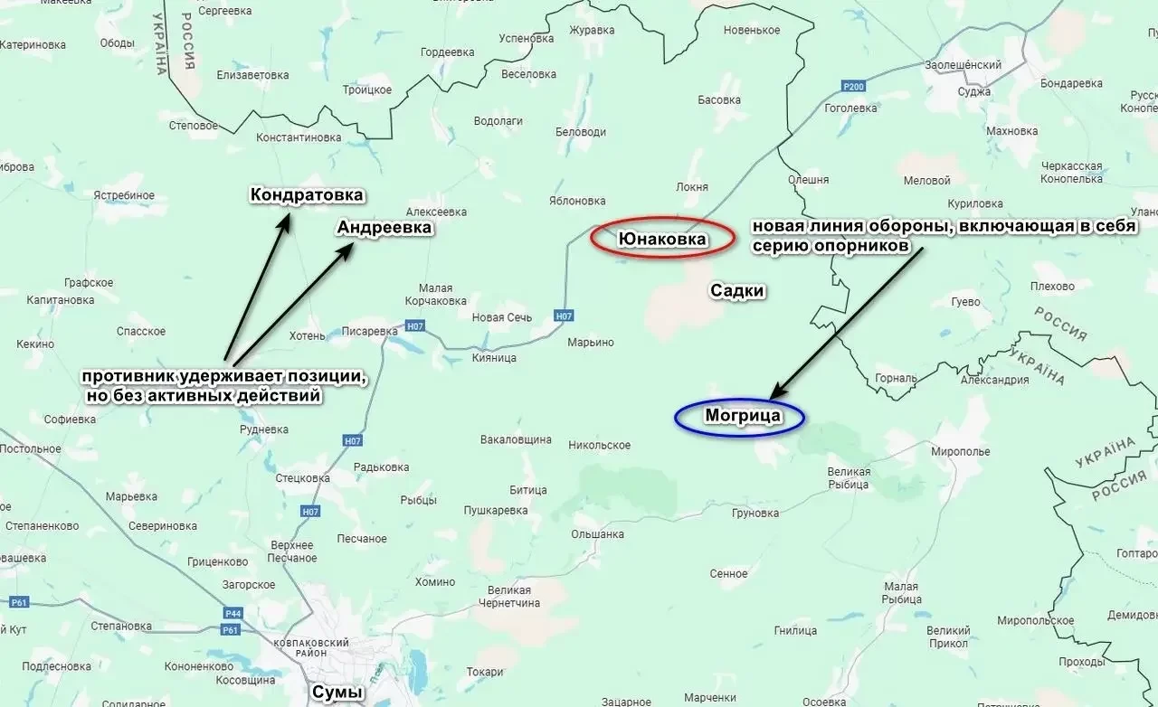 Как подчеркивается, противник пытался до самого конца удерживать часть Юнаковки, несмотря на потери. Та же самая 47-я бригада была переброшена в село с Теткинского направления с задачей не дать российским войскам овладеть населенным пунктом, имеющим для ВСУ важнейшее значение, поскольку закрывало дорогу на Сумы. Сейчас противник отступил с линии Юнаковка - Садки в район села Могрицы, где идет создание новой линии обороны. Также не исключено, что враг будет предпринимать попытки вернуть позиции в Юнаковке.