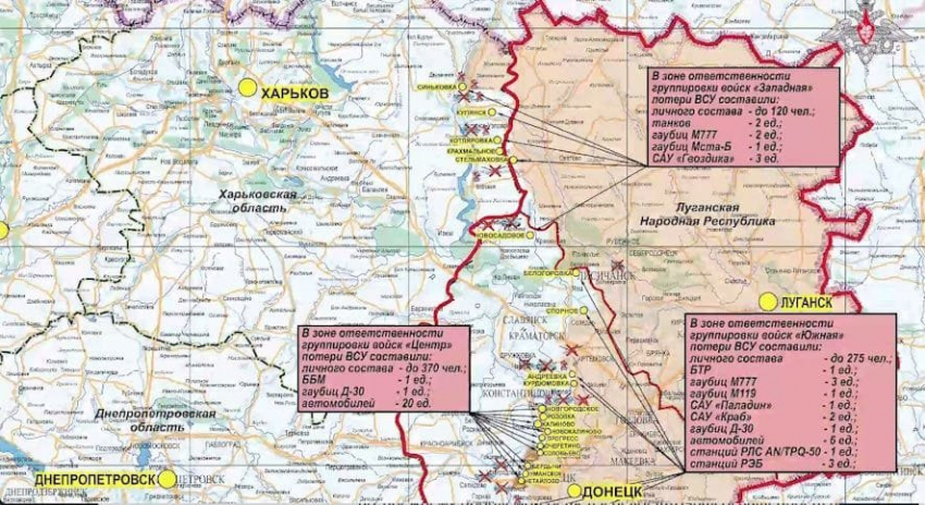 Группировка войск «Запад» улучшила положение по переднему краю и освободила населенный пункт Кисловка в Харьковской области. Отражены 2 контратаки ВСУ в районах н.п. Григоровка ДНР и Стельмаховка ЛНР, потери противника составили до 55-ти военнослужащих и две гаубицы Д-30.