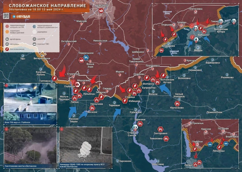 Войска РФ продолжают наступление на северо-востоке Волчанска, обходя аэропорт и приближаясь к мясокомбинату. ВСУ не имеют укреплений и, вероятно, сосредоточат оборону у реки Волчья. Снабжение украинцев также оказывается проблематичным из-за нехватки запасов и разрушенных мостов. Бои ведутся в промзоне Волчанска. После захвата Волчанска следующей целью станет Белый колодец, который важен для снабжения войск в Купянске. На втором направлении наши продвигаются в сторону Липцов (и Харькова). Поднимается российский флаг над Глубоким.