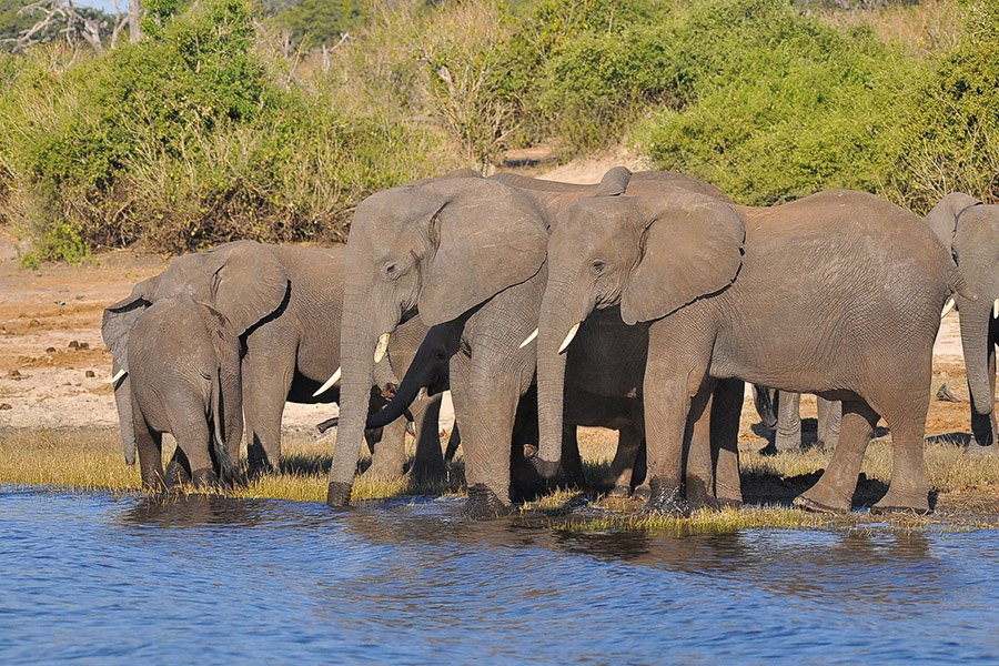 Слоны-самцы собираются в вечерней прохладе, чтобы попить. После некоторого времени старший самец поднимает голову и отворачивается от водопоя. Слегка похлопывая ушами, он издает глубокий, звучный гул.
