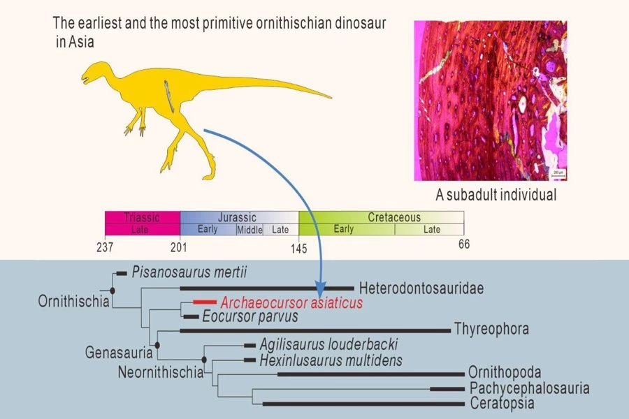 По словам группы палеонтологов из Китая, недавно обнаруженный вид, получивший название Archaeocursor asiaticus, является самым ранним дивергентным птицетазовым динозавром, когда-либо обнаруженным в Азии. Новое исследование было опубликовано в журнале iScience.