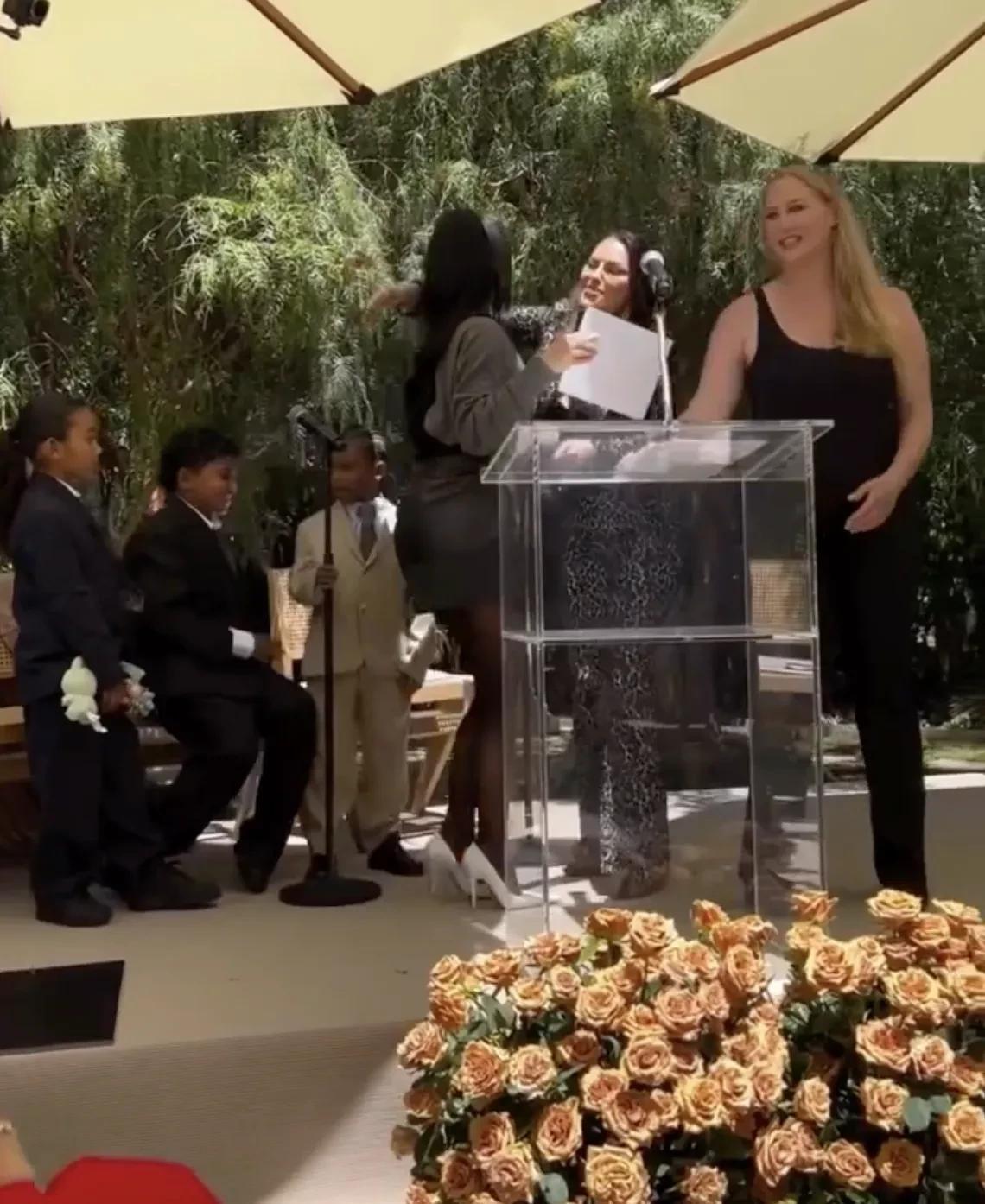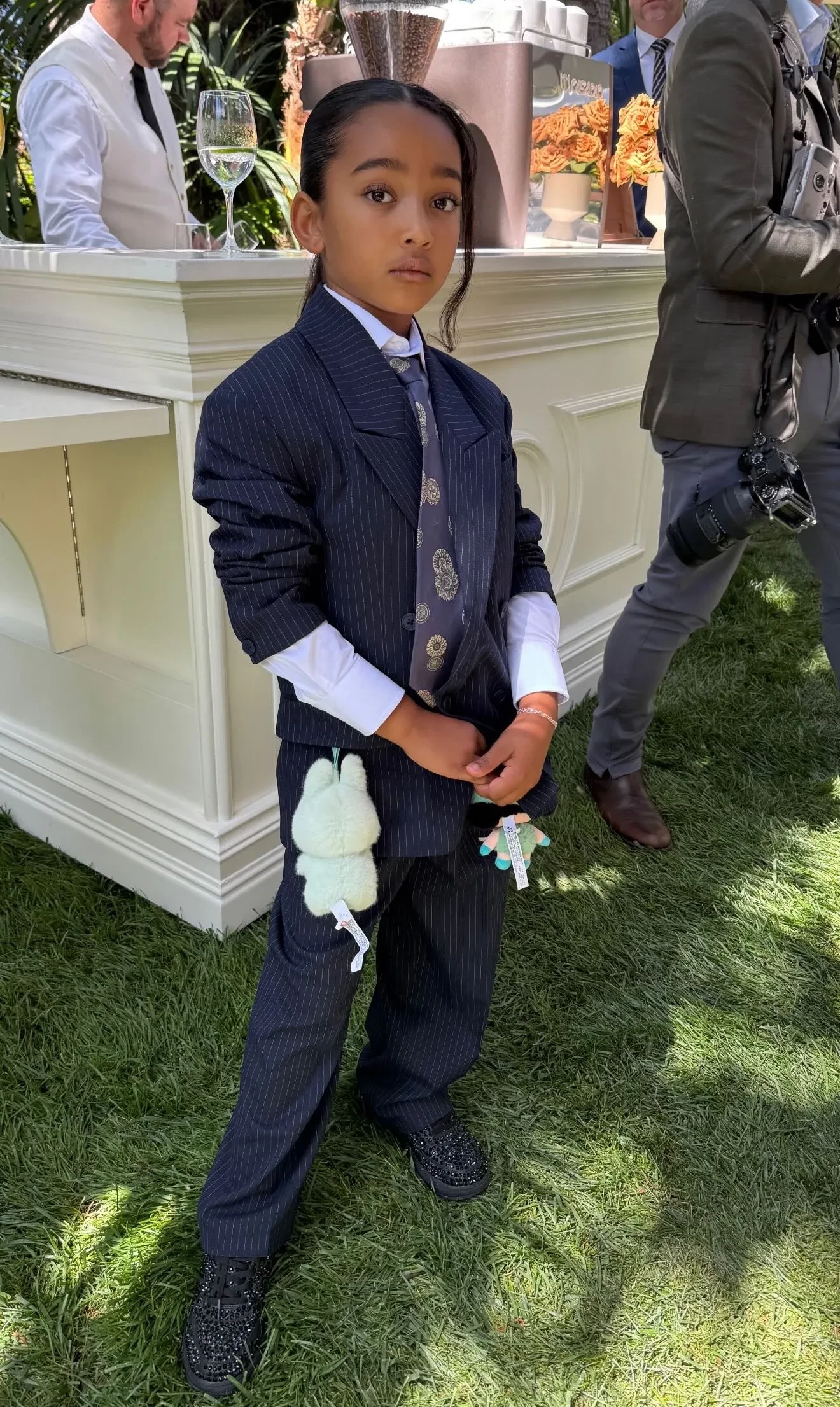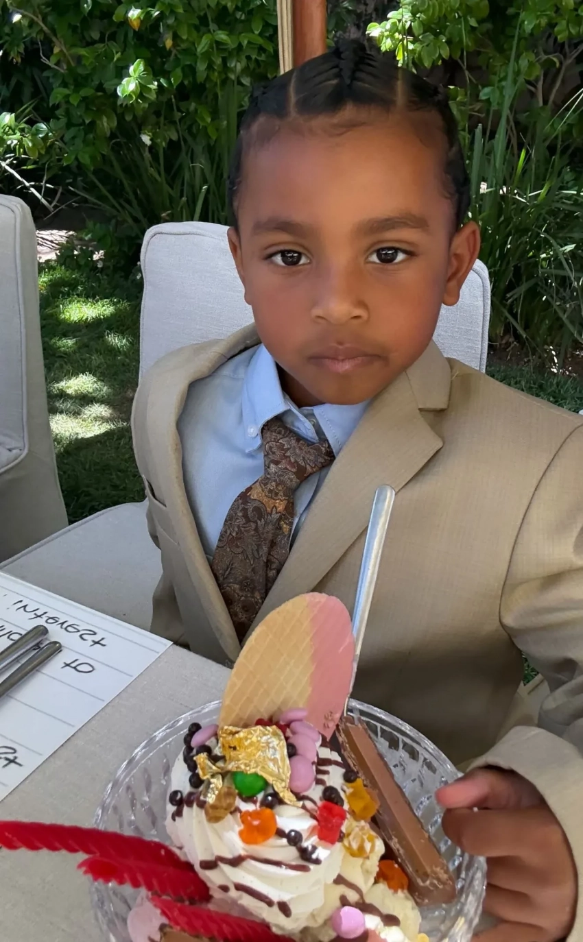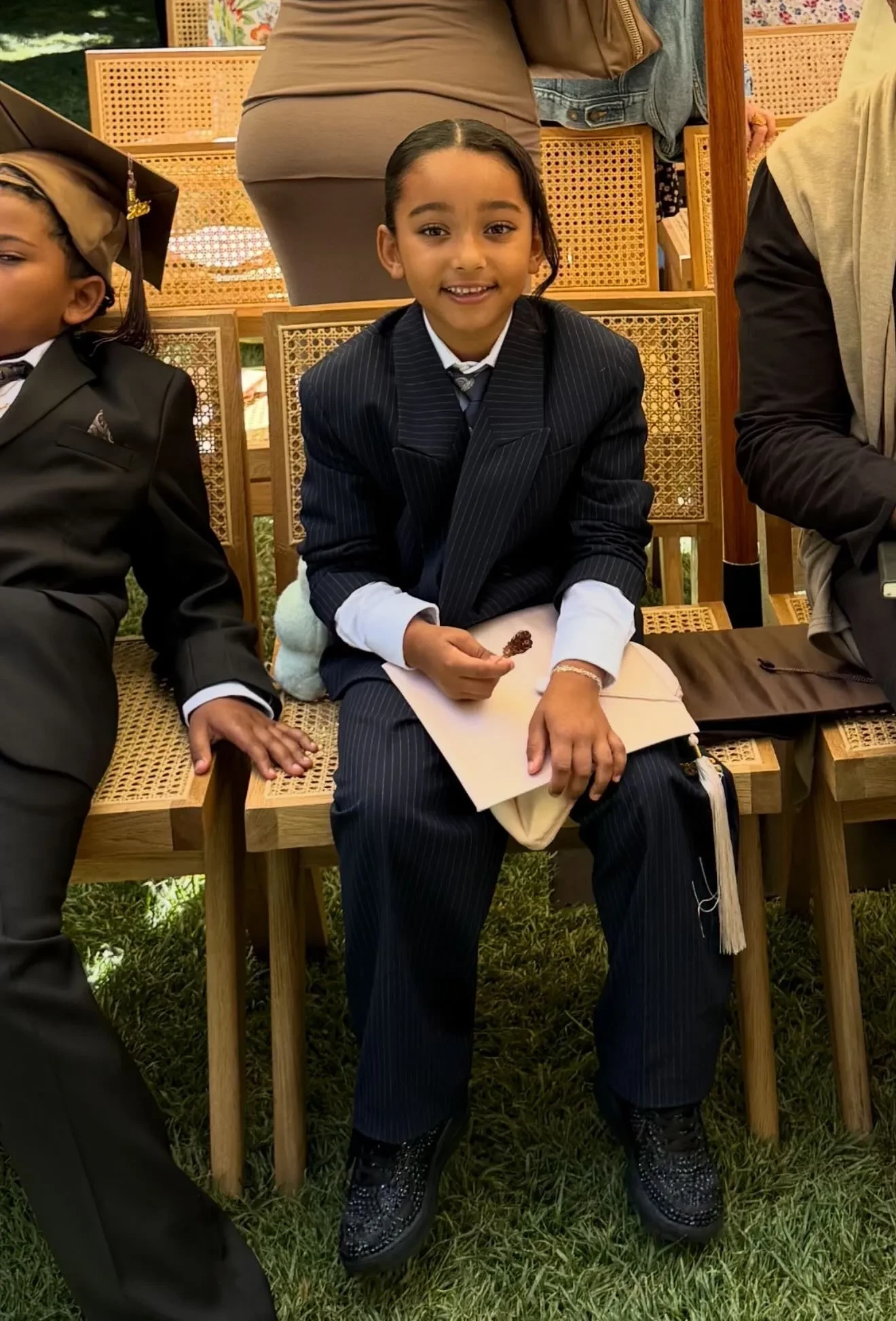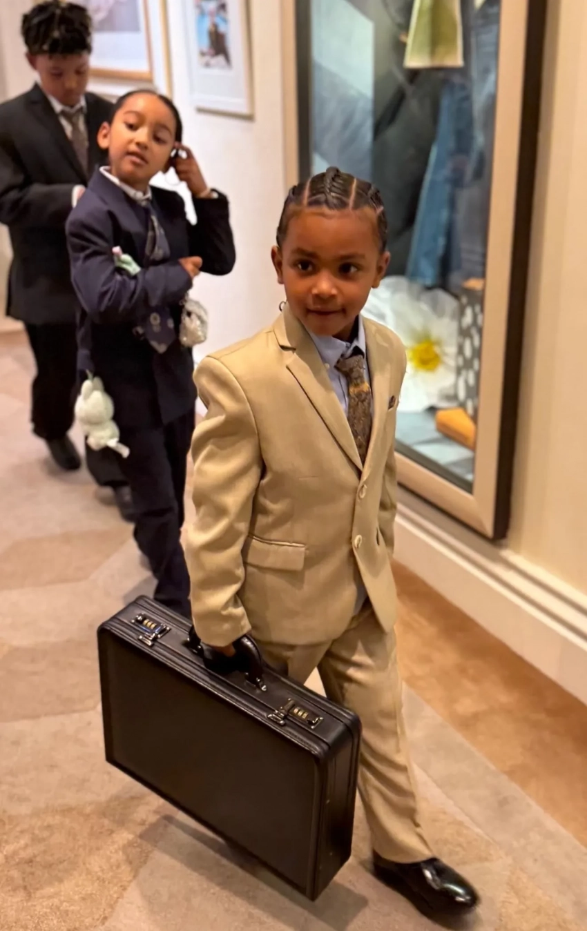 Ким КардашьянПсалм УэстНа выпускной пришли трое из четырёх детей Ким от Канье Уэста. Старшая и самая популярная из них, Норт, пропустила мероприятие. Младшего сына Псалма Ким нарядила в образ своего отца, известного адвоката Роберта Кардашьяна, а дочери Чикаго достался мемный лук матери на фоне Гарвардской школы.