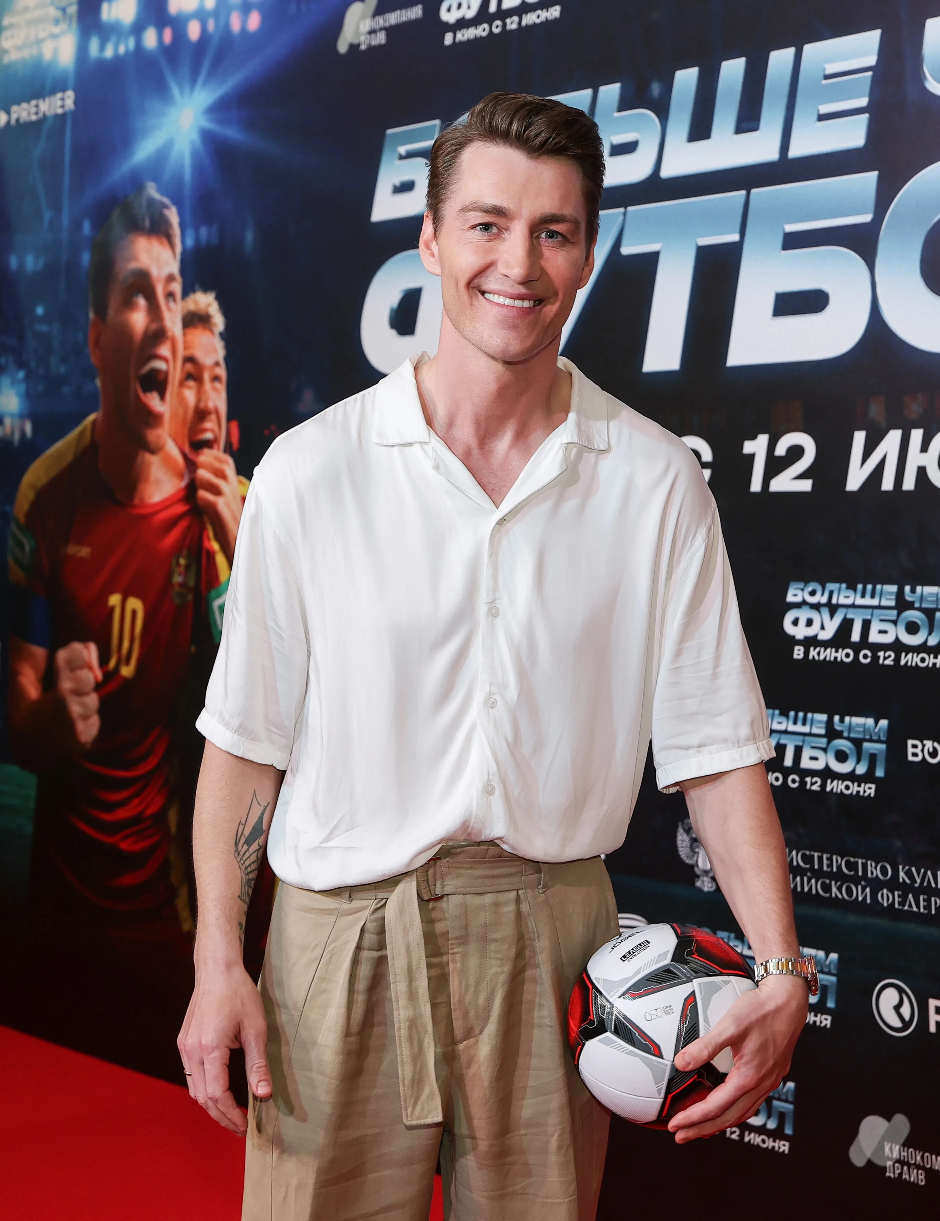 Дмитрий Песков и Алексей ЗемскийАлексей ВоробьёвАлексей Воробьёв и Адель ГудаускасАделина СотниковаАлександр Самойленко с семьёйПо сюжету фильма "Больше чем футбол" на Кубок Европы по футболу вместо сборной Англии едет ранее вылетевшая и расформированная сборная России. Есть всего две недели, чтобы заново собрать команду из "сбитых летчиков". Один из спортсменов и главная звезда местного футбола, Иванов, соглашается вернуться к работе ради тяжелобольной дочери, так как победы команды помогают ей чувствовать себя лучше. Картина "Больше чем футбол" выйдет в широкий прокат 12 июня.