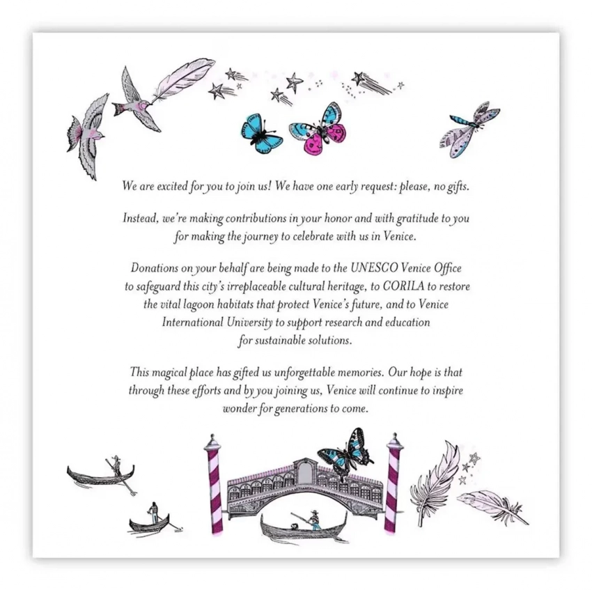 Лорен Санчес и Джефф БезосПомимо мер безопасности в сети обсуждают и приглашение на свадьбу Джеффа и Лорен, которое уже высмеяли пользователи. Оно напечатано курсивом на белом фоне и украшено бабочками, звёздами и гондолами. Ксения Собчак отметила, что пригласительное похоже на "открытку в духе рассылок от родственников на праздники в What’sApp". В соцсетях также пишут, что более пригласительное безвкусное и от одного из самых богатых людей мира можно было бы ожидать чего-то более элегантного.
