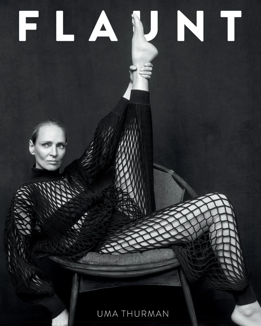 Ума Турман украсила обложку свежего выпуска Flaunt Magazine. 52-летняя актриса снялась в чёрно-белой фотосессии авторства фэшн-фотографа Марка Селигера, для которой примерила образы от Alaïa, Ann Demeulemeester, Giorgio Armani, Gabriela Hearst, Carven и Saint Laurent. На снимках Ума предстала в комбинезоне-сетке, в классической белой рубашке и брюках, а также в жилете, надетом на голое тело.