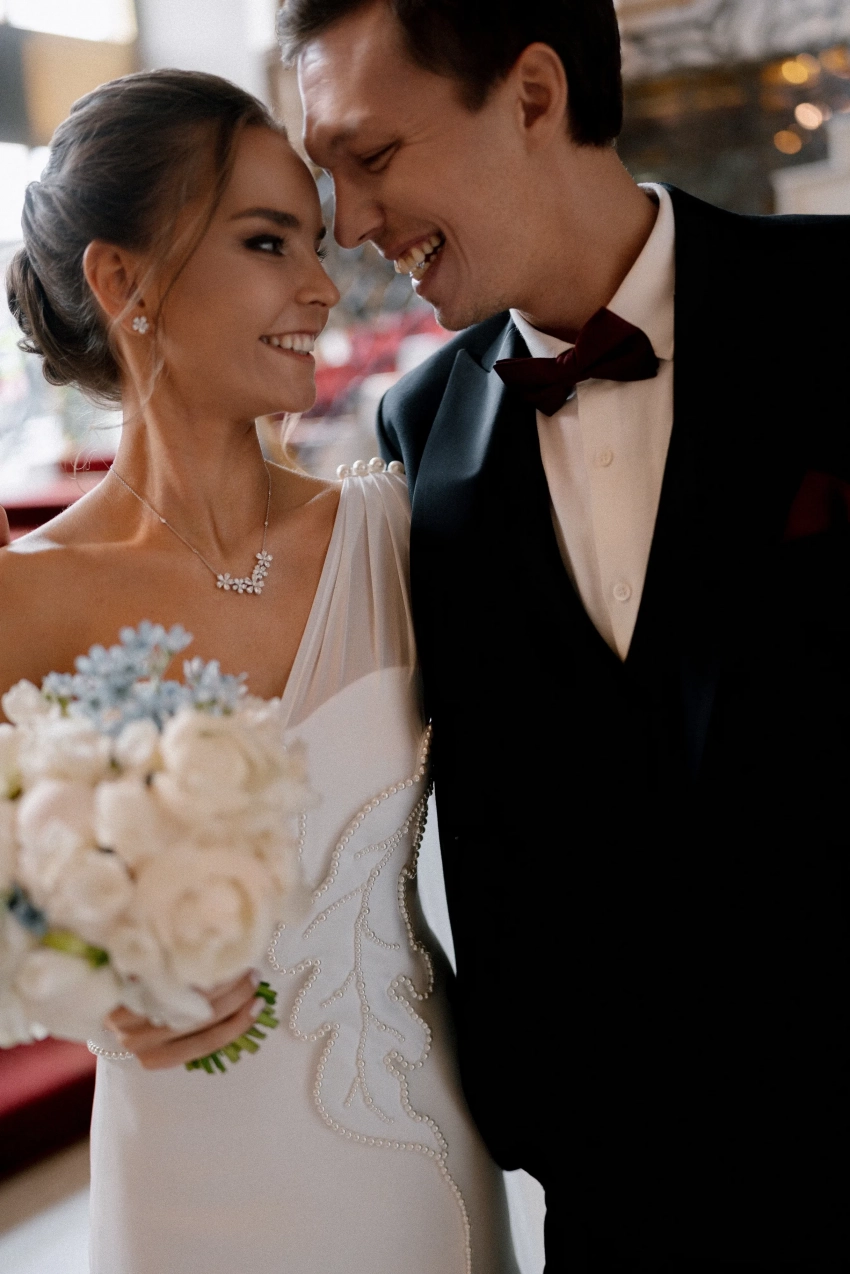 Сегодня в сети появились новые снимки со свадебной фотосессии и из ЗАГСа: фотосессия молодожёнов прошла в отеле "Балчуг Кемпински". На снимках невеста позирует в платье с разрезом бренда "Хохлома x Алёна Ахмадуллина" и в украшениях Mercury.
