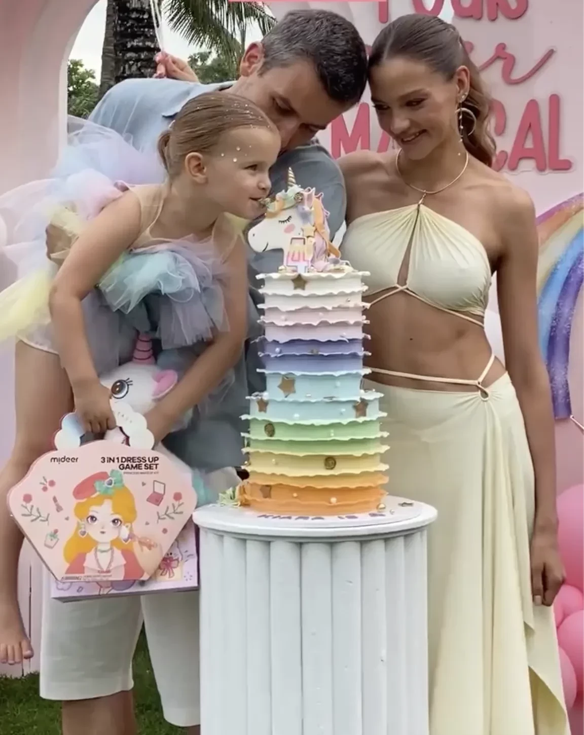 Алеся Кафельникова и Георгий Петришин с дочерьюАлеся Кафельникова и Георгий Петришин с дочерьюАлеся Кафельникова и Георгий Петришин с дочерьюДень рождения Киары прошёл на берегу океана, предположительно на Бали, где Кафельникова часто живёт с семьёй. Территорию у бассейна украсили надувной замок и воздушные шары. Детей и взрослых развлекали аниматоры-русалки, угощали разноцветным тортом, а вечером был фейерверк на пляже.