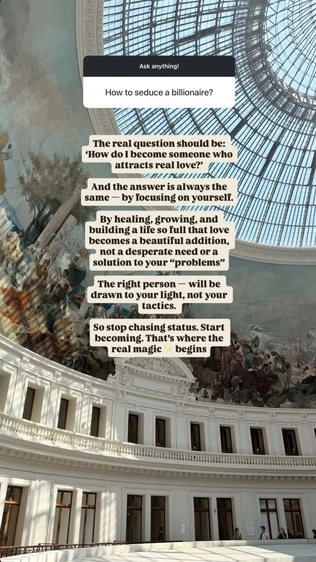 Ранее Юлия Вавилова рассказывала, как разбогатеть. По её мнению, необходимо развиваться и инвестировать в своё развитие. При этом она уточнила, что если мыслить позитивно, то Вселенная может дать всё, что ты захочешь: "Вселенная даст вам всё, что вы заслуживаете, у неё нет границ". Сама Вавилова часто что-то просит у Вселенной: она уже публиковала список желаний, в котором была машина, украшения и сумки "биркин", которую она в итоге получила от своего бойфренда Павла Дурова. Также недавно он подарил ей роль в кино во время благотворительного вечера в Каннах.