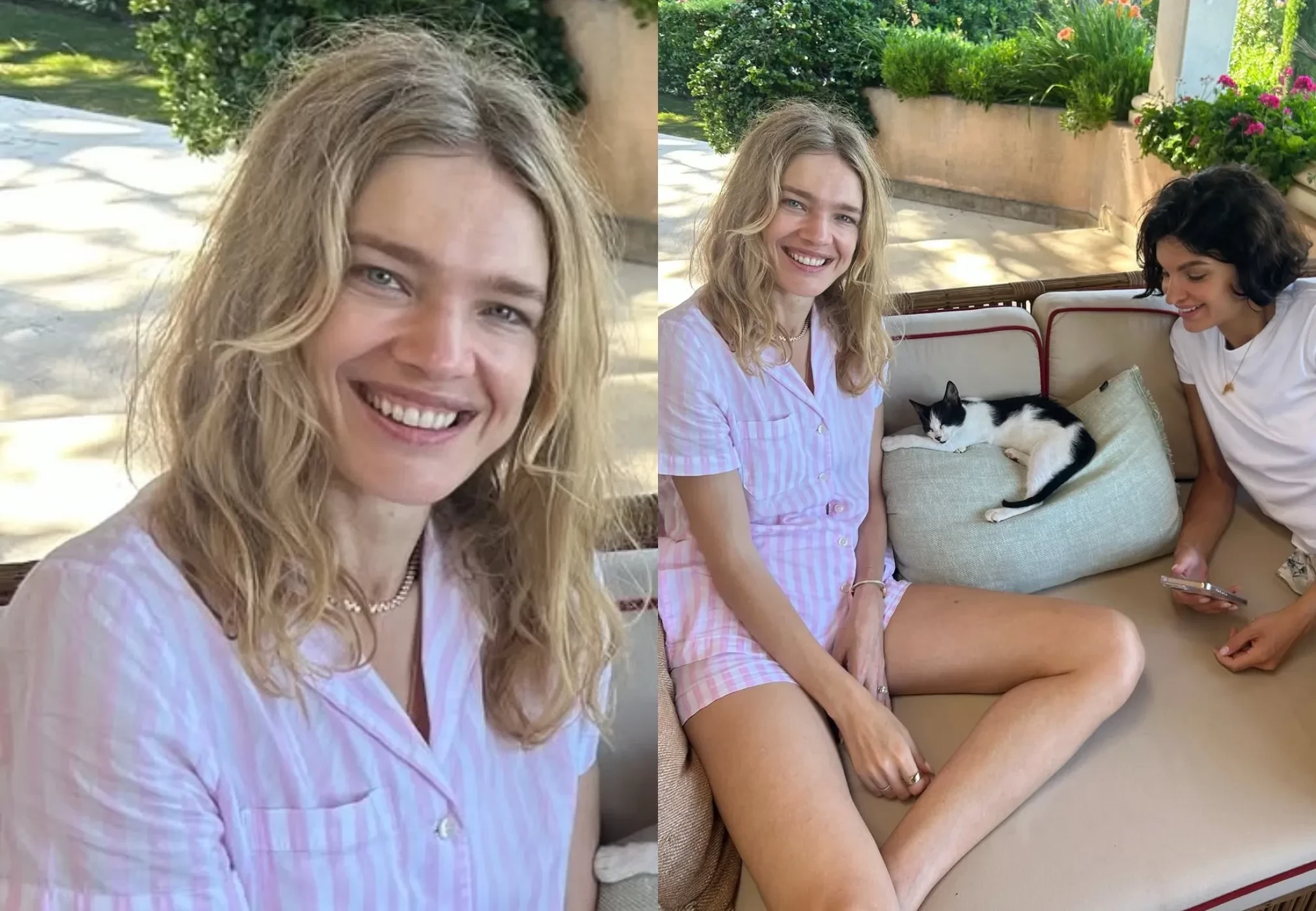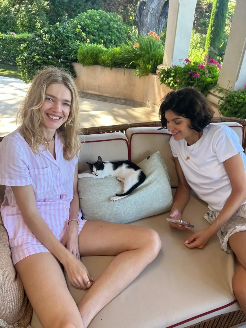 Алиса показала, как прошёл её июль, и на одном из фото она запечатлена на отдыхе с Натальей. На фото супермодель с улыбкой позирует в розовой рубашке и шортах на диване вместе с Вольской и котом, который, возможно, сам зашёл на территорию.