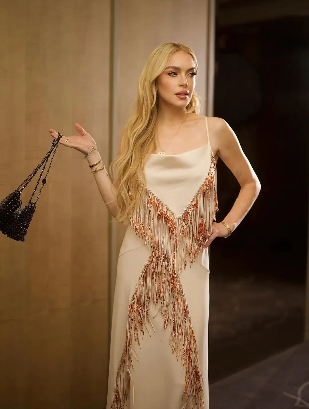 Актриса выгуляла в Мексике два новых образа. На дорожку она вышла в барбикор-стиле: она надела платье Balmain и босоножки Christian Louboutin цвета фуксии, дополнив наряд клатчем и помадой в тон. Так же Лохан примерила платье с бахромой от Rabanne и в обуви Paris Texas.