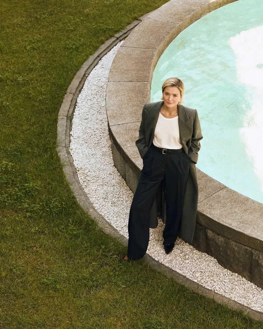 Для фотосессии Надежда примерила платье и юбку с георгинами, красное платье из шёлка, костюм из твида, шерстяное пальто и другие изделия из новой коллекции бренда.