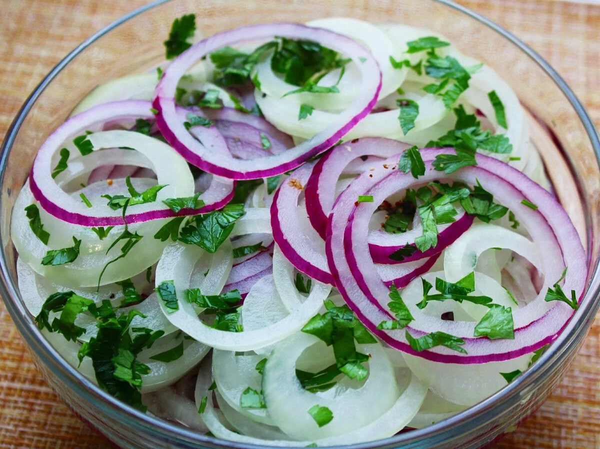 Совет: Перед маринованием слегка отожмите лук с солью, чтобы он быстрее пропитался.