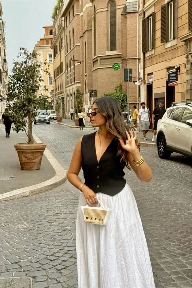3. Белая юбка + костюмный жилет: офисный шик летом